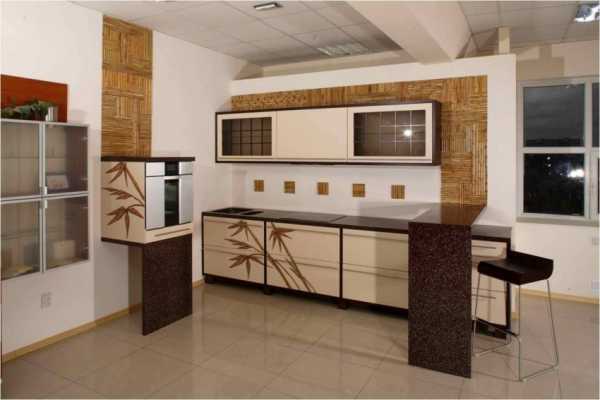 - На кухне. Чтобы натуральные бамбуковые обои не оказались поглотителем многочисленных кухонных запахов, обои с рисунком бамбука в интерьере кухни будут лучшим выбором. Для части над рабочим столом можно сделать специальный фартук с бамбуковым рисунком, который дополнит основные обои.
