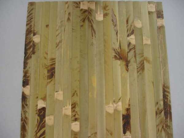 Обои из внешней части ствола имеют ярко выраженный природный орнамент, натуральную неоднородную поверхность и стойкость к ультрафиолетовым лучам. Цветовые вариации таких обоев достаточно разнообразны: фисташковые, ванильные, зеленые, шоколадные, а также оттенки венге и черепаховые, получаемые путем неравномерного обжига поверхности бамбуковых ламелей.