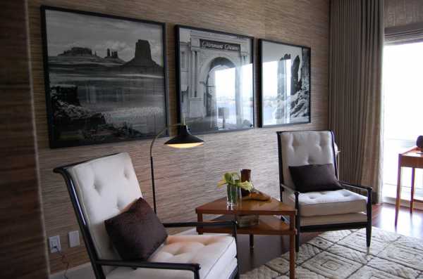Обои из натуральных растительных волокон светлых спокойных тонов в небольшой гостиной