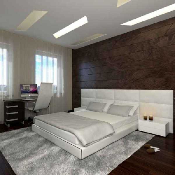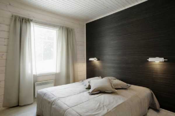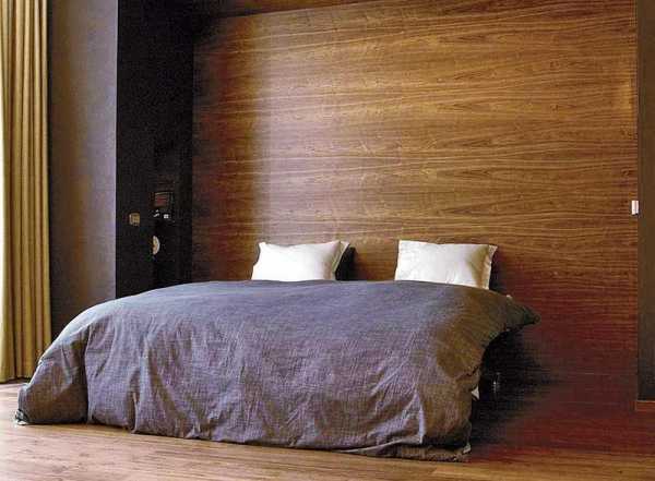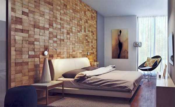 Особенно эффектно такой вариант декорирования будет смотреться, если мебель в спальне будет контрастного цвета (например, белая). Также допускается использовать такие обои как имитацию панно, в таком случае обычно используются фотообои. Модное решение — мозаика из древесных материалов, она также способна добавить изящества в спокойную обстановку.