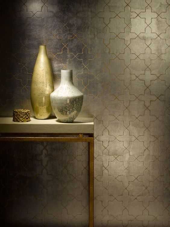 Металлические обои необычны, поэтому всегда являются центром дизайнерской композиции. В этом аспекте важно суметь правильно подобрать тип фактуры и цвет. Например, в ампире царят античные настроения, реализация которых производится искусственно состаренными или реально антикварными предметами обстановки: лепниной, статуэтками, различными украшениями. Идеальным фоном для них станут стены с золотым, серебряным или бронзовым отливом и оригинальным узором. В хай-тековской обстановке прекрасно будет чувствовать себя однотонное металлизированное полотно с тиснением, в комбинации с патинированными обоями и элементами сдержанной классики.