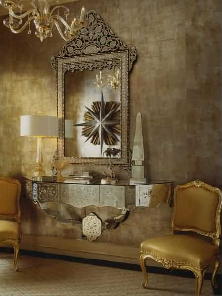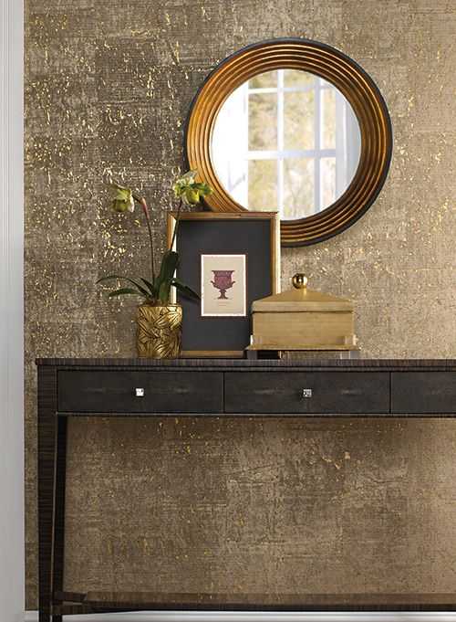 Еще одним потрясающим вариантом отделки интерьера являются обои под кожу с серебряным или золотым тиснением. Бесспорно, такая роскошь – прерогатива дворцовых интерьеров, тем не менее, тисненая кожа активно используется в воспроизведении современных стилей обстановки. Лучшим напарником такой отделке станет антиквариат.