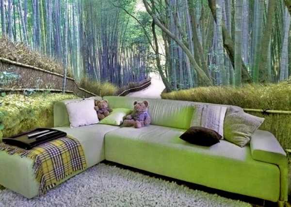 Необязательно ограничиваться спокойными натуральными оттенками. Можно использовать деревянные обои нестандартных цветов. Такой нетипичный дизайн понравится творческим натурам. Покрытия с изображениями экзотических деревьев удивят ваших гостей, особенно такой выбор будет уместен для комнат в японском стиле.
