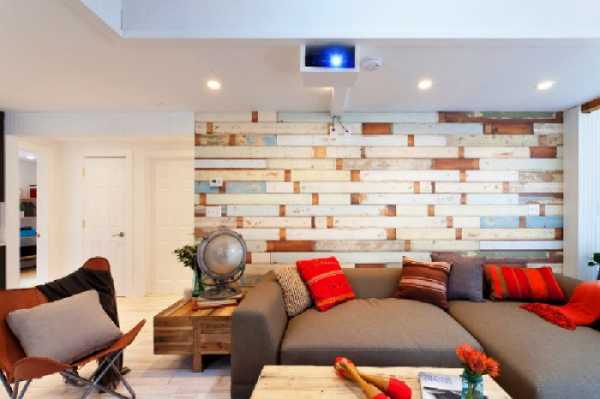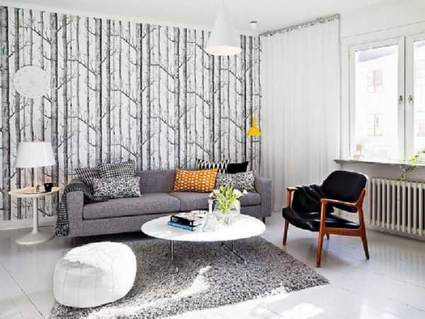 Стилизованное под дерево обойное покрытие можно использовать для зонирования пространства. В нижней части стен можно использовать более темные цвета, а, начиная с середины, светлые оттенки. Такое оформление характерно для кантри, прованса и классического стилей. В помещении с недостаточно высокими потолками используйте вертикальное расположение рисунка, так вы сможете зрительно увеличить высоту гостиной.
