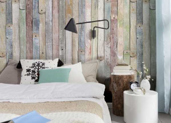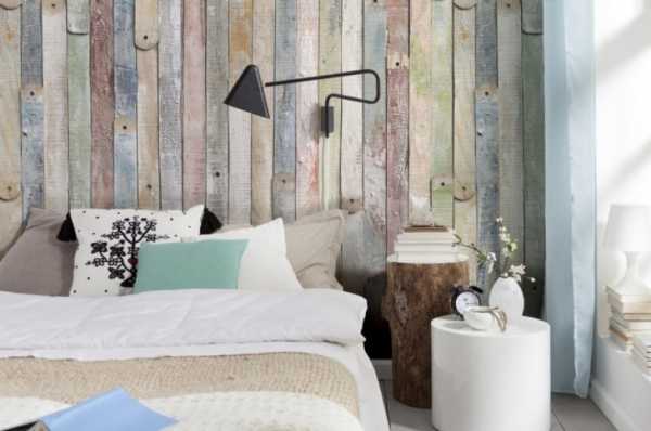 Для стен в спальне обычно используется светлое дерево. Это связано с тем, что чаще всего эта комната небольшого размера, а темные оттенки визуально уменьшат ее еще больше. Так что здесь будут уместны белые и бежевые материалы. Обои под имитацию дерева такого цвета можно клеить по всей площади помещения, но выглядеть это будет достаточно скучно и невыразительно, поэтому не забудьте добавить яркие элементы декора.