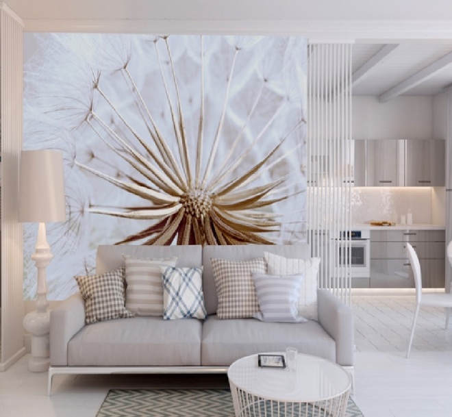 Говоря о расширении пространства с помощью фотообоев, нужно понимать, что большие по габаритам рисунки в сочетании с текстурой «пыль» вряд ли помогут вам добиться желаемого результата. Крупный предмет на первом плане будет превосходить по размерам мебель, таким образом, сужая пространство.