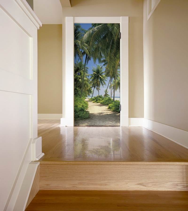 - отлично подходят для оформления полотна, имитирующие продолжение комнаты. Окна и двери, изображенные на них, будут давать ощущение дополнительного пространства за пределами стены, например, в прихожей. Фото фотообоев в интерьере хорошо демонстрируют, насколько удачным может быть такое решение;
