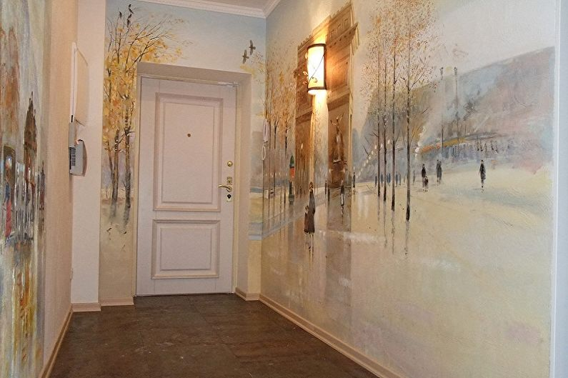 В холле частного дома для отделки стен использованы фотообои, имитирующие роспись красками