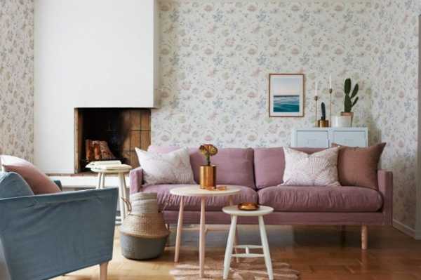 В небольшой гостиной не пропишется крупный рисунок или мелкий масштаб орнамента. В первой версии рисунок будет восприниматься отдельно и выглядеть неуместно, во второй – комната будет безликой. С пестротой красок тоже следует быть осторожными. В варианте, когда вы не сможете полностью отказаться от цветовой интенсивности, наклейте бумагу только на одну вертикаль, а три остальные оформите в один из оттенков узора или лавируйте среди нежной гаммы светлых тонов.