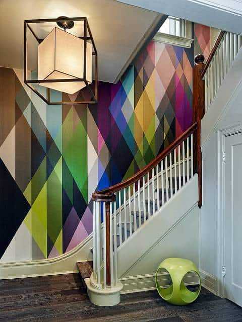 А вот такое яркое оформление подойдет для прихожей — здесь вы проводите мало времени, а насыщенные цветные геометрические фигуры могут и утомить, если долго их созерцать.