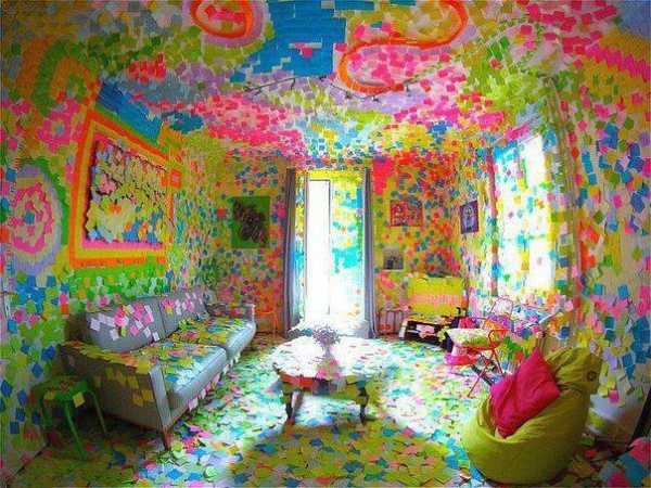 Стоит отметить, что каждая бумажка полотна имеет несколько листиков для заметок разных цветов. Таким образом, вы каждый раз можете менять дизайн комнаты, отрывая их в произвольном порядке. Конечно же, важно добавить, что такие обои очень непрактичны.