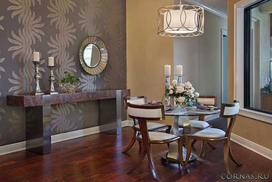 ΠΠ»Ρ ΠΌΠ°Π»Π΅Π½ΡΠΊΠΎΠΉ Π³ΠΎΡΡΠΈΠ½ΠΎΠΉ Π»ΡΡΡΠ΅ ΠΏΠΎΠ΄ΠΎΠ±ΡΠ°ΡΡ Π±Π΅Π· ΡΠΈΡΡΠ½ΠΊΠ° ΠΈΠ»ΠΈ ΠΆΠ΅ Ρ ΠΌΠ΅Π»ΠΊΠΈΠΌ ΡΠΈΡΡΠ½ΠΊΠΎΠΌ. ΠΠ΅Π»ΠΊΠΈΠΉ ΠΎΡΠ½Π°ΠΌΠ΅Π½Ρ ΠΏΠΎΠ·Π²ΠΎΠ»ΠΈΡ ΡΠ°ΠΊ ΠΆΠ΅ Π²ΠΈΠ·ΡΠ°Π»ΡΠ½ΠΎ ΡΠ²Π΅Π»ΠΈΡΠΈΡΡ ΠΏΡΠΎΡΡΡΠ°Π½ΡΡΠ²ΠΎ ΠΌΠ°Π»Π΅Π½ΡΠΊΠΎΠΉ ΠΊΠΎΠΌΠ½Π°ΡΡ. ΠΡΡΠΏΠ½ΡΠΉ ΡΠΈΡΡΠ½ΠΎΠΊ Π·Π΄Π΅ΡΡ ΠΊΠ°ΡΠ΅Π³ΠΎΡΠΈΡΠ΅ΡΠΊΠΈ Π½Π΅ ΠΏΠΎΠ΄Ρ ΠΎΠ΄ΠΈΡ, Π΅ΡΠ»ΠΈ Π²Ρ Ρ ΠΎΡΠΈΡΠ΅, ΡΡΠΎΠ±Ρ Π² Π³ΠΎΡΡΠΈΠ½ΠΎΠΉ Π½Π΅ Π±ΡΠ»ΠΎ ΡΠΊΡΡΠ½ΠΎ, ΡΠΎΠ³Π΄Π° Π½Π° ΠΎΠ΄Π½ΠΎΠΉ ΠΈΠ· ΡΡΠ΅Π½ ΡΠ»Π΅Π΄ΡΠ΅Ρ ΡΠ°Π·ΠΌΠ΅ΡΡΠΈΡΡ ΡΠΎΡΠΎΠΎΠ±ΠΎΠΈ Ρ ΠΏΠ°Π½ΠΎΡΠ°ΠΌΠ½ΡΠΌ ΠΈΠ·ΠΎΠ±ΡΠ°ΠΆΠ΅Π½ΠΈΠ΅ΠΌ. ΠΡΠΎ ΠΏΡΠΈΠ΄Π°ΡΡ ΠΏΠΎΠΌΠ΅ΡΠ΅Π½ΠΈΡ Π΄ΠΈΠ½Π°ΠΌΠΈΠΊΠΈ ΠΈ ΠΏΡΠΈ ΡΡΠΎΠΌ Π²ΠΈΠ·ΡΠ°Π»ΡΠ½ΠΎ ΡΠ²Π΅Π»ΠΈΡΠΈΡ Π΅Π³ΠΎ.