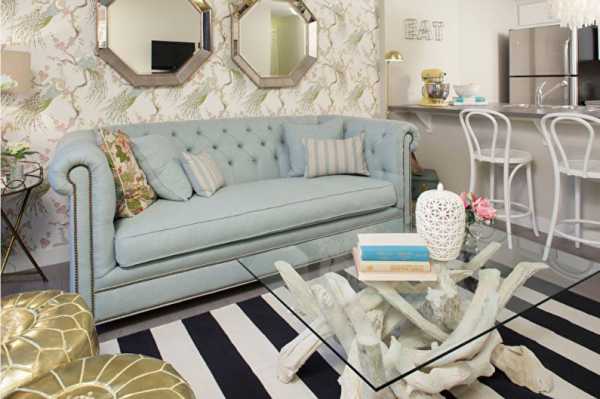 Яркие вкрапления в виде мебели или декора разнообразят дизайн, а нейтральные оттенки скроют недостатки маленьких гостиных.
