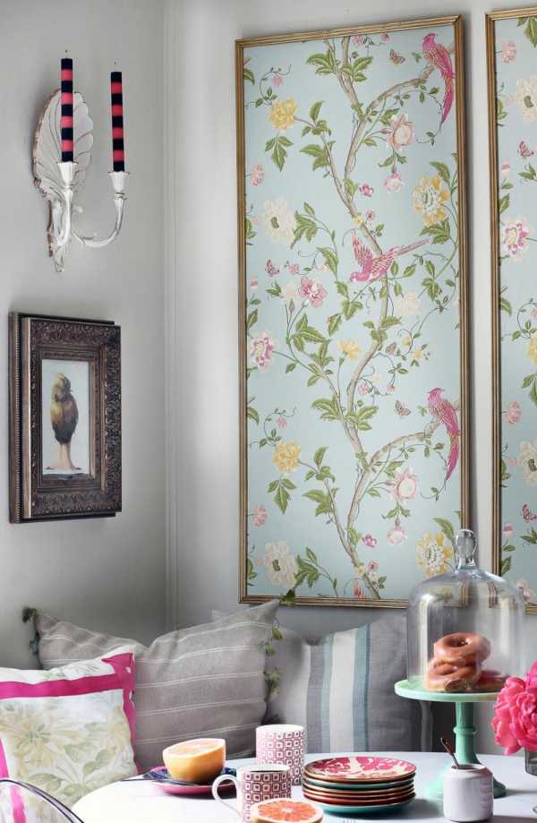 При всей своей простоте исполнения обойные вставки могут послужить и средством зонирования. Размещение в рамках цветных фрагментов может обозначить зону отдыха или игр для детей.