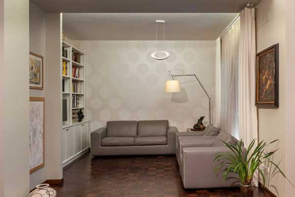 - Сбалансировать геометрию зала. Узкая комната не станет шире, а потолок не поднимется, какими обоями их ни поклей. Однако визуально увеличит объем помещения градация оттенка стен от более темного к более светлому.