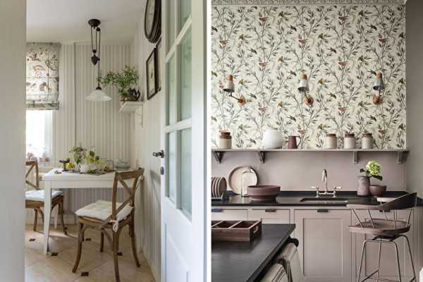 Обоями облицовывают в основном обеденную область или ту, что расположена далеко от плиты. Если фартук однотонный, можно позволить отделку с яркими принтами, осуществив тем самым визуальное зонирование.