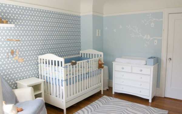 - Новорожденные малыши. В этот период дети нуждаются в спокойной нежной обстановке, лишенной раздражающих факторов. Обои для новорожденного мальчика выполняются в пастельных тонах. Акценты расставляются при помощи картинок четкого цвета.