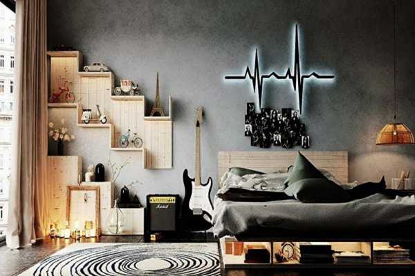 Например, если подросток играет на гитаре, то ее непременно стоит разместить на поверхности стены, где обои должны быть однотонными. Также с противоположной стороны можно разместить фотообои либо постеры с изображением любимой группы.