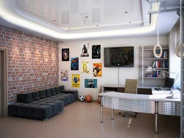 Форма мебели стандартная, сама мебель достаточно компактная, допускается включение в интерьер ассиметричных линий. Дизайн комнаты в этом стиле предполагает акцентирование внимания входящего на какой-либо отдельной особенности помещения, к примеру, на необычном расположении компьютерного стола, или кровати, огромном фото любимого спортсмена на стене. Поклонниками конструктивизма являются и многие взрослые, потому интерьер комнаты подростка может повторять дизайн комнаты для юноши 20 лет, фото которой можно видеть ниже.