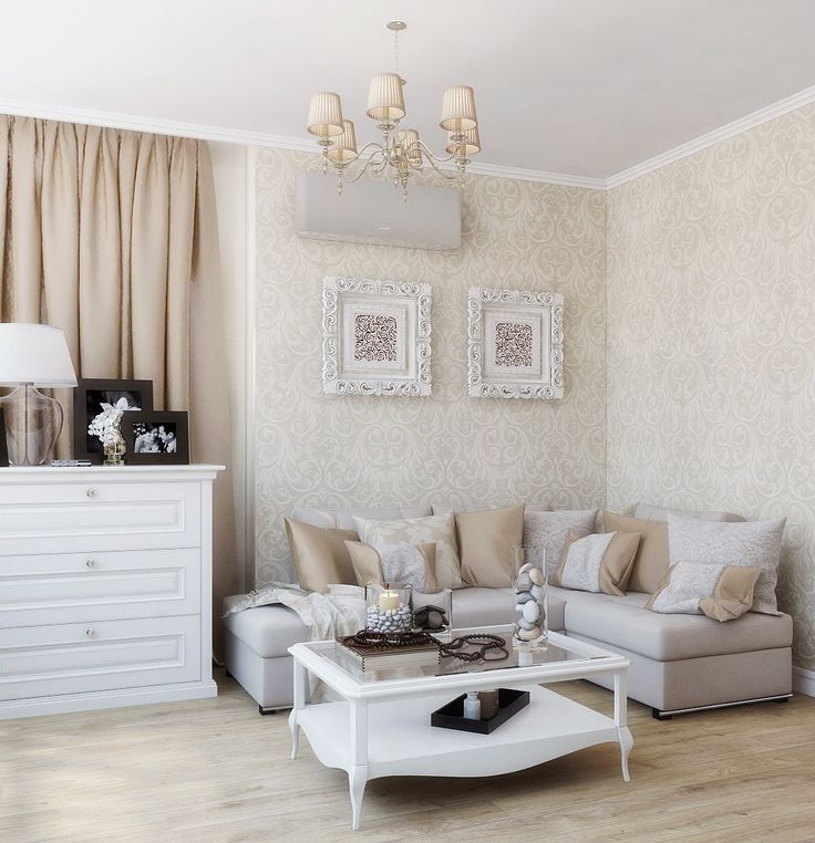 Добавить комнате уюта помогают бежевые обои, с которыми гостиная выглядит элегантно и спокойно