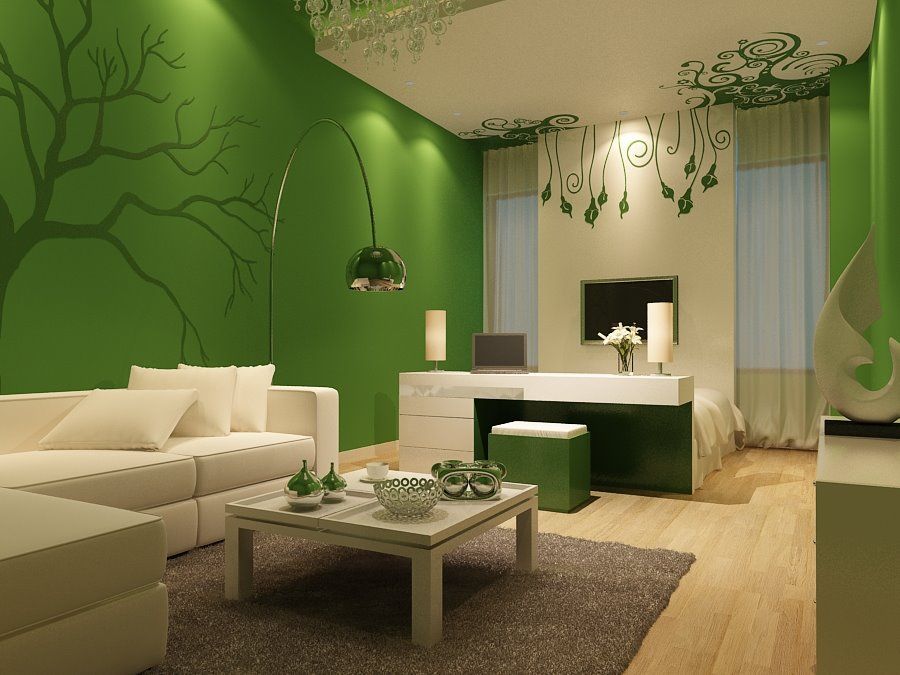 Если у вас зал совсем небольшой, то примените фотообои, расширяющие пространство. Всегда способна визуально увеличить комнату отделка натурального зеленого цвета. В нашем случае создать интерьер в эко стиле – самый лучший вариант.
