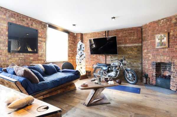 Не исключены, однако, включения ярких колористических акцентов, разбавляющих скупую мужскую палитру. Так, на фото (внизу слева) изображение британского флага на подушке кому-то может напомнить о легендарных британских музыкальных группах или рок гитаристах, а кто-то просто предствавит Лондоне в интерьере этой гостиной. На другом фото (внизу справа) номерные знаки на машину изобретательно сложены в виде кубов и служат оригинальными светильниками.