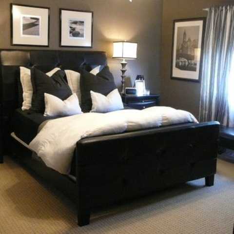 Цвета выбирайте сдержанные, не кричащие. Серая, коричневая, черная, синяя гамма подходит для такой спальни.