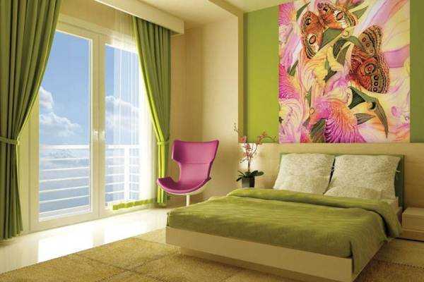 Зеленый помогает достичь гармонии и избавиться от отрицательных эмоции. Идеальное цветовое решение для спальни.