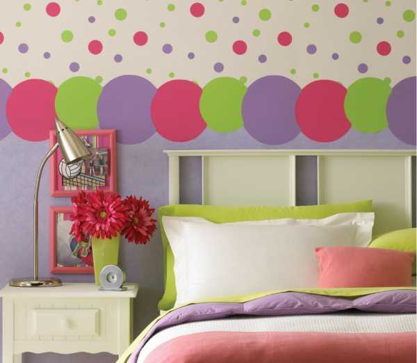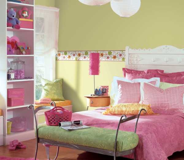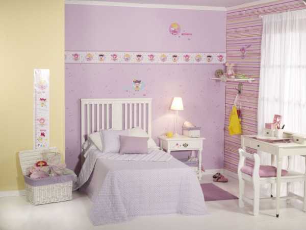 Бордюр в детской наклеен на границе цветных и однотонных обоев