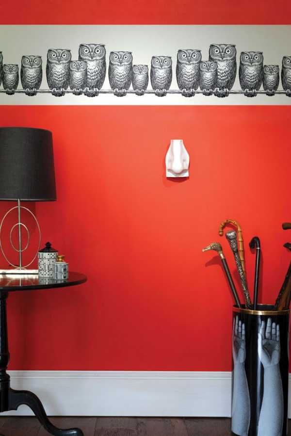 Во-вторых, при помощи бордюра можно визуально разграничить пространство. Так, например, если в помещении высокие потолки, контрастная полоска бумаги под потолком выгодно подчеркнет их. Прекрасно послужит она и для разделения двух видов обоев, и для зрительного увеличения или уменьшения комнаты.
