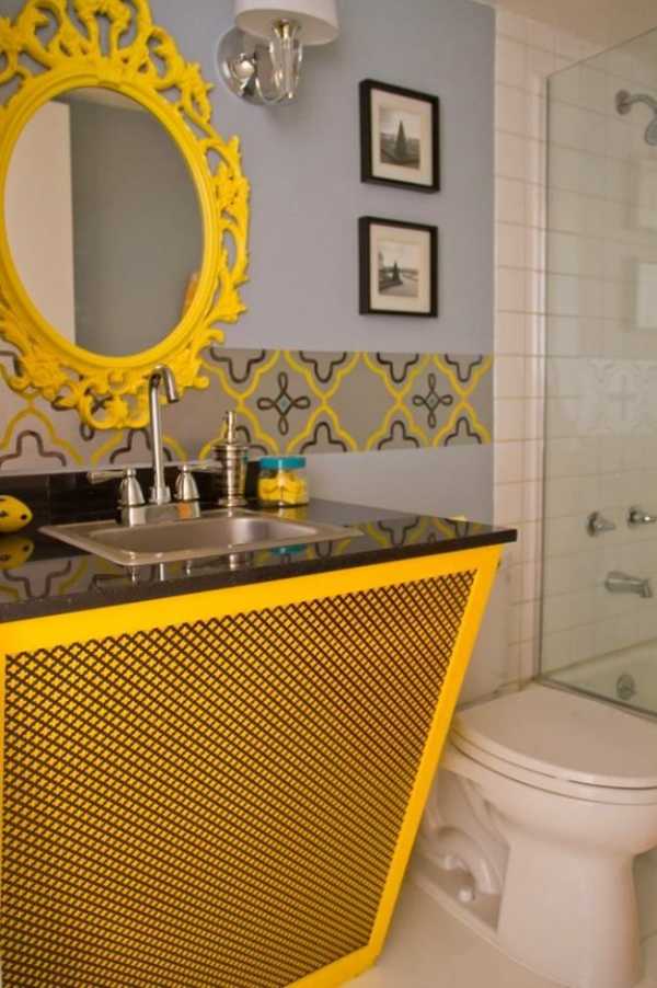 Яркий цвет бордюра перекликается с желтыми предметами мебели в ванной