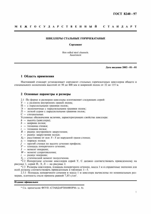 Название англ.: Hot-rolled steel channels. AssortmentСодержание госта: Настоящий стандарт устанавливает сортамент стальных горячекатаных швеллеров общего и специального назначения высотой от 50 до 400 мм и шириной полок от 32 до 115 мм