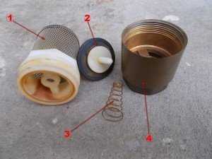 Конструкция обратного клапана состоит из металлического сетчатого фильтра-1,клапана-2, возвратной пружины-3 и корпуса -4.