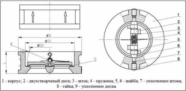 Конструктивно межфланцевые обратные клапаны бывают двухстворчатые и пружинные дисковые.Пружинные дисковые модели (их иногда называют одностворчатыми) имеют затвор в виде плоского диска, который в закрытом положении прижимается к седлу корпуса пружиной.