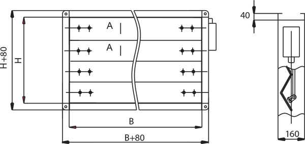 | Типоразмер клапана | Площадь живого сечения, кв.м. | Число лопаток n | размеры, мм | Число ТЭНов n1 | Мощность кВт | Масса, кг (без МЭО) | |||
