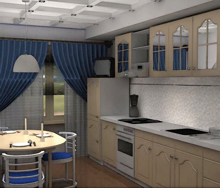 Если интерьер кухни 8 метров предполагает высокие потолки, то, чтобы скрыть коммуникации и удобно вмонтировать осветительные приборы, вполне можно создать потолочную конструкцию из гипсокартона.