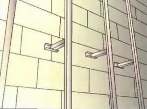 - Профили устанавливаются вертикально с шагом около 50 см с помощью подвесов к стене.