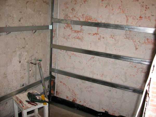 Вместо этого на замену несущим профилям ставятся две вертикали из направляющих ножками вовнутрь проёма. Затем в нужных местах монтируются горизонтальные поперечины из любого материала. Это может быть как направляющий, так и несущий профиль. Что касается отделки сплошных стен, то здесь пришла пора заметить, что металлическая обрешётка обычно используется под гипсокартон. В чем здесь особенность? Она состоит из двух направляющих в районе потолка и пола, объединённых рядом вертикалей, установленных с нужным шагом. Обычно это 60 см. То есть, такая конструкция в корне не годится для панелей МДФ или ПВХ, по той простой причине, что в этом случае направляющие должны быть расположены горизонтально. Казалось бы, проблему можно решить, установив поперечины, но на практике для этого придётся применять, как мы уже сказали, множество крабов.