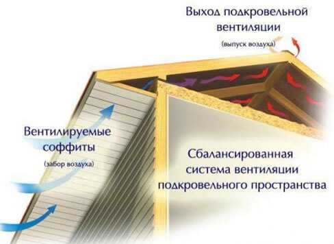 Подшивая крышу, между софитами оставляют зазор 1-1,5 см. Это расстояние необходимо для создания естественной тяги воздушного потока. Воздух движется от нижней кромки ската в пространство под крышей, где нагревается и продолжает движение к коньку. Здесь через вентиляционные отверстия воздушный поток выходит наружу. Такая циркуляция эффективно выветривает влагу, оставляя кровлю сухой. Благодаря хорошей вентиляции не происходит появление грибка и плесени, чем продлевается срок службы кровли.