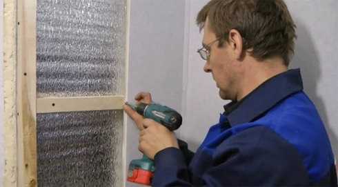 Затем в ячейки между профилями укладывают и крепят утеплитель, как правило, используют пенопласт. Так как его легко приклеивать к поверхности, его толщину можно подобрать под нужные размеры, пенопласт легко подрезать и формировать в нужные формы.