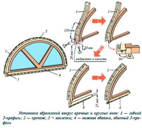 - При облицовке арочного окна применяют также J-профиль, который надрезают в нескольких местах для плавного изгиба, или же гибкий пластиковый вариант этого элемента фурнитуры.