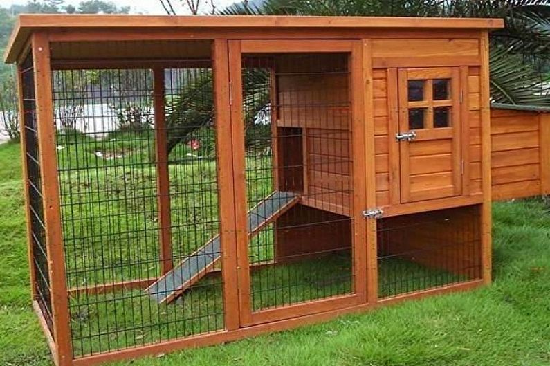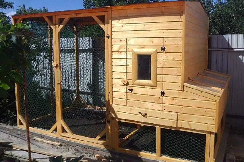 Вольер пристраивают к меньшей стене сарая. В этом месте обустраивают своими руками выход. Если внутри курятник разбит на секции, то на примыкающих к коридору простенках крепят гнезда. У противоположной стены устанавливают емкости с золой для купания птиц. Кормушки традиционно ставят на полу.