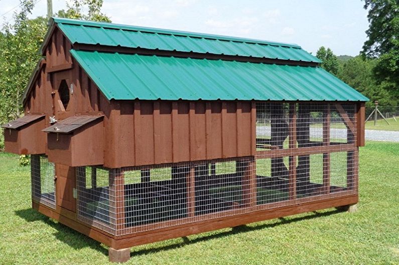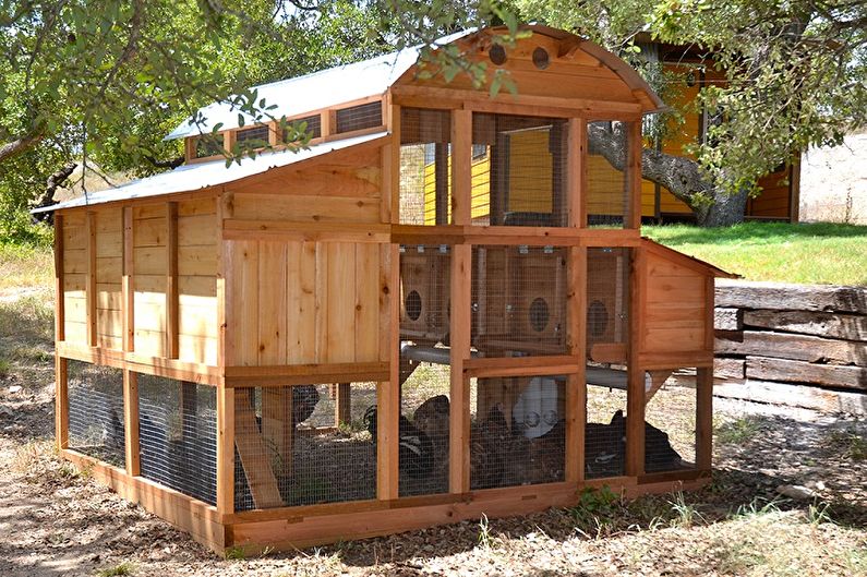 Я знаю кое-кого, кто делит свой садовый сарай со своими курицами. Их территория отделена секциями с выходом наружу. Это очень безопасная и надежная конструкция, которая прекрасно использует имеющееся пространство.