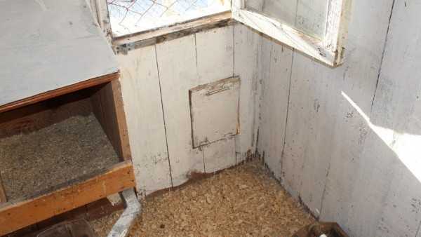 На стенах своими руками обустраивают окна для естественного освещения. По размеру и количеству они составляют 1/10 часть от общей площади пола. На нижней части стены предусматривают выход в вольер и люк для выбрасывания помета при замене подстилки.