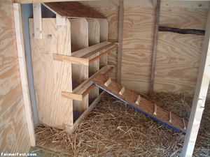 Чтобы обеспечить больший комфорт для несушек, гнёзда нужно выстлать слоем хорошей соломы. А также, подойдут опилки от дерева. Небольшой совет: Куры-несушки любят откладывать свои яйца в укромных местах, именно поэтому при оборудовании курятника гнездом, необходимо расположить его так, чтобы туда не попадал прямой солнечный свет. Гнёзда можно устанавливать прямо под насестом, но при таком варианте, из-за соблюдения гигиены, придётся устанавливать также небольшие навесы, поскольку курицы могут грязнить, сбрасывая помет и перья.