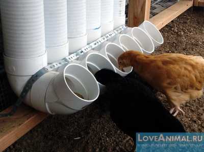 Поилки и кормушки приобретают заводские или собирают своими руками. В ход идут ПВХ трубы, ПЭТ бутылки и другая тара. Емкости подвешивают на веревках или крепят к стене на высоте 20 см. Куры не должны залезать внутрь поилки или кормушки.