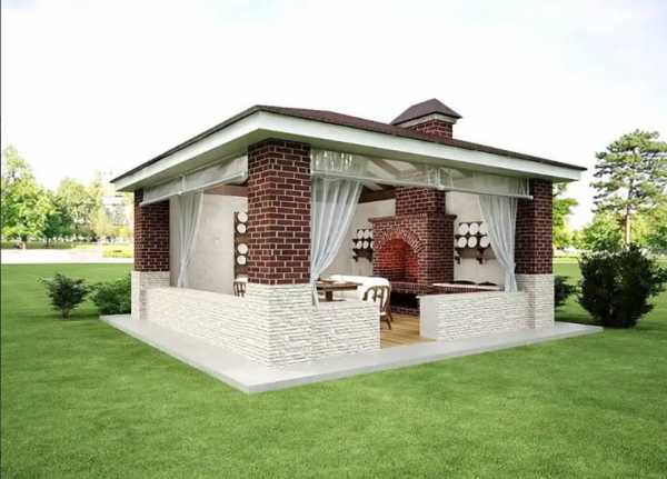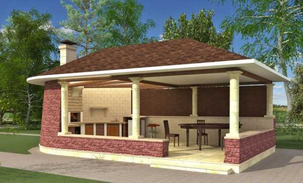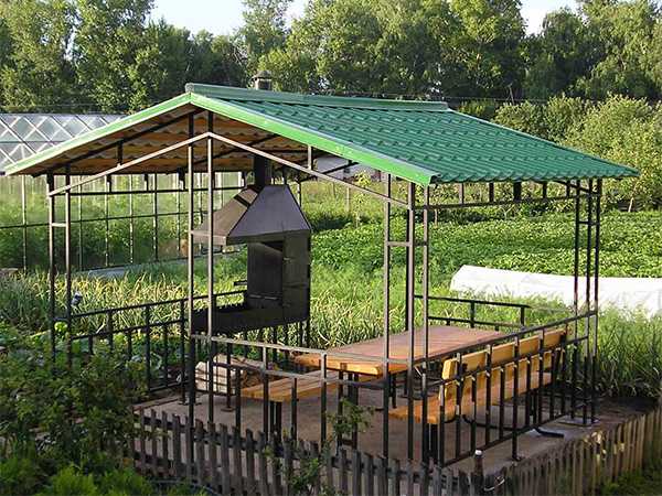 - крышу в кухне-беседке тоже делают под уклоном, материал должен быть легким – подойдет битумная черепица, поликарбонат или шифер, они должны слегка выступать за пределы беседки;