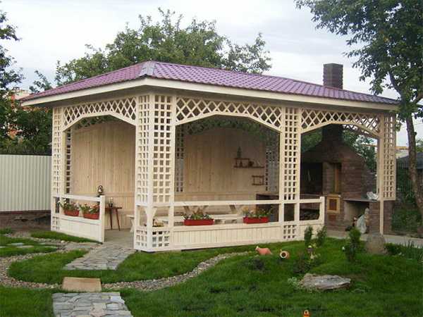 Деревянная беседка – изящная и легкая конструкция, которая может использоваться как летняя кухня, при этом она будет хорошо вписываться в ландшафт, а постройка не займет много сил и времени. При этом важно помнить, что деревянные элементы нуждаются в уходе и предварительной обработке, иначе материал будет быстро изнашиваться.