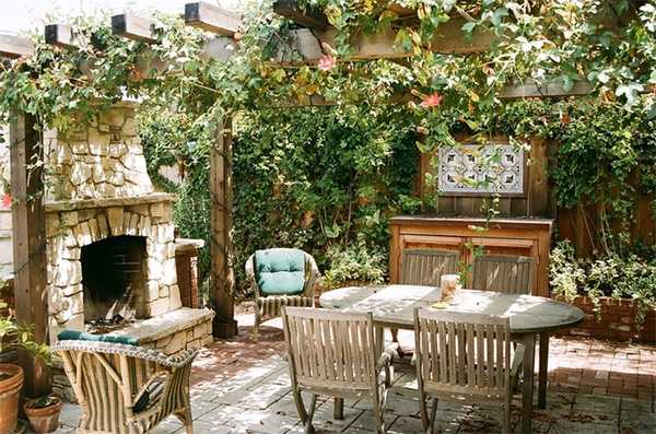 Основное правило – постройка должна гармонировать со всем участком, особенно – с домом. Часто летние кухни на даче напоминают сказочные домики иди беседки. Такой антураж создать просто: достаточно лишь фонариков, нескольких резных украшений на каркасных столбах и вьющихся растений вокруг беседки. Если климат позволяет, то их можно сочетать с виноградом.