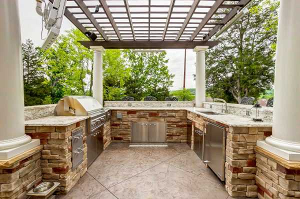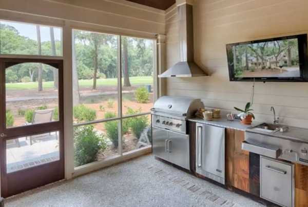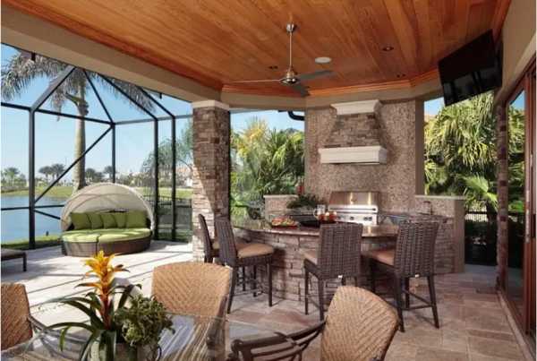 Посмотрите дизайн летней кухни на фото, показывающем варианты внутренней отделки и декора:
